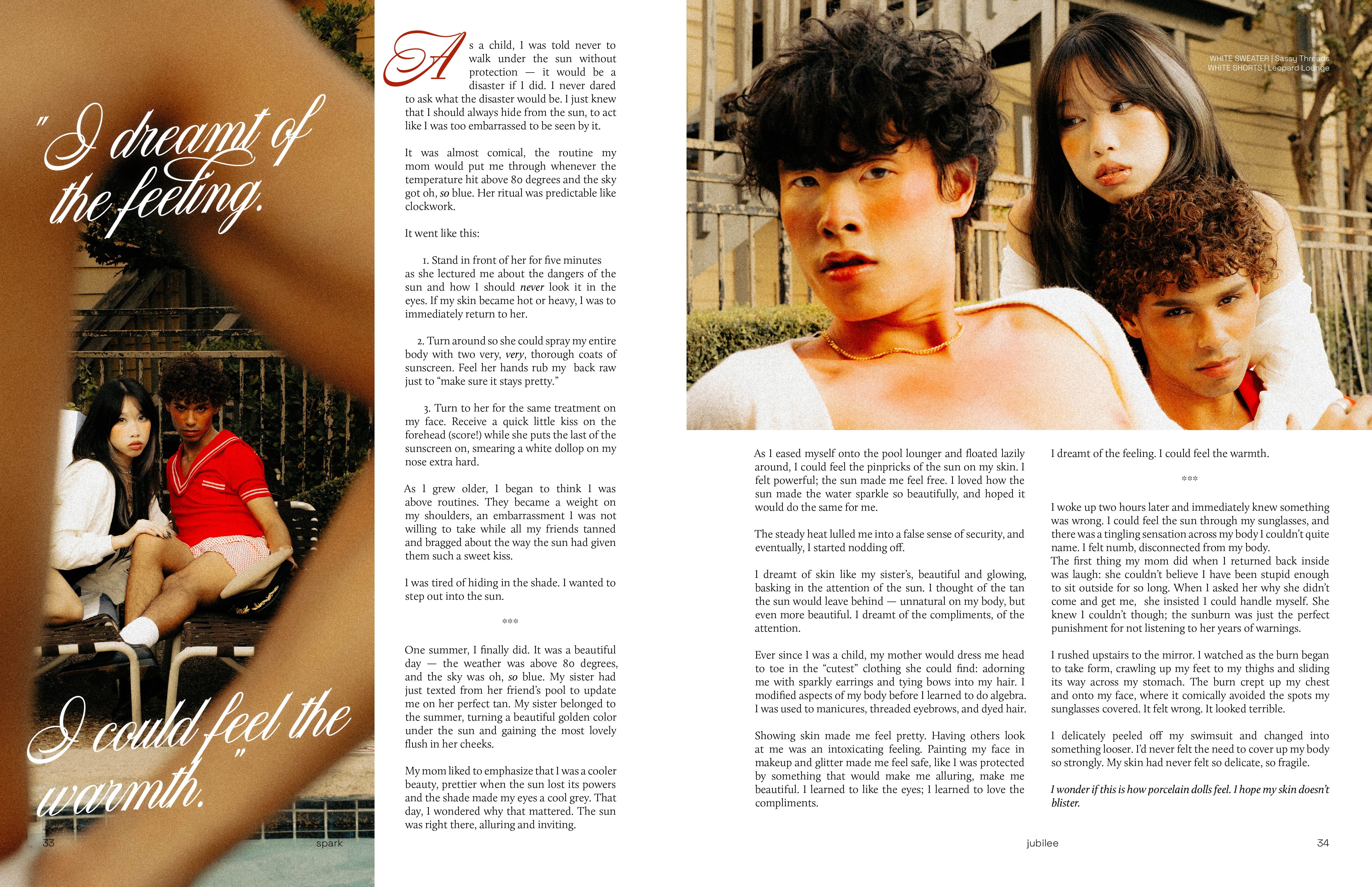 That summer, I discovered something about myself: that there is a version of me that can exist beautifully in the summer. I revel in the fact that even though I was set up to never find it, I did anyway. Even though the sun had barraged my skin and rubbed it raw, it still left me with a kiss goodbye. Maybe, just maybe, I’ll skip the extra dollops of sunscreen on my face this summer. ■