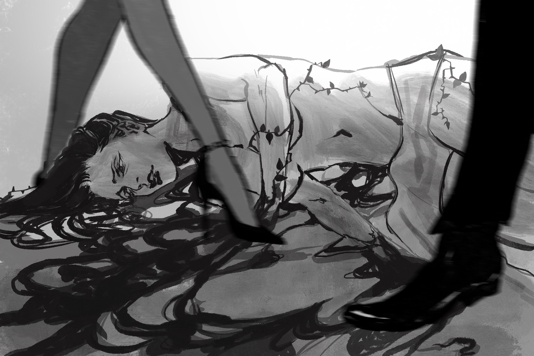 Their pointy shoes and straightened slacks stomp centimeters from my face,