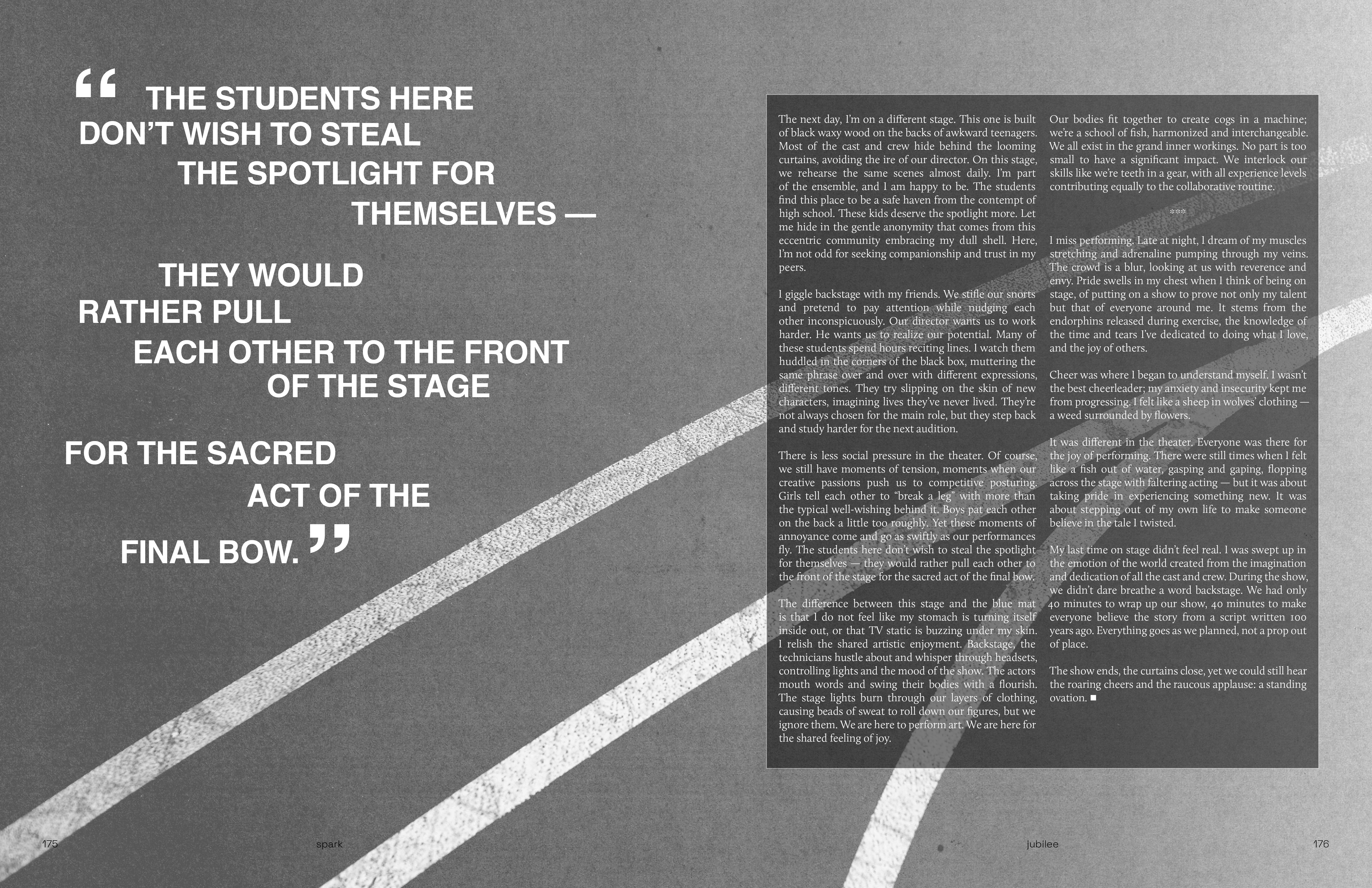 I miss performing. Late at night, I dream of my muscles stretching and adrenaline pumping through my veins. The crowd is a blur, looking at us with reverence and envy. Pride swells in my chest when I think of being on stage, of putting on a show to prove not only my talent but that of everyone around me. It stems from the endorphins released during exercise, the knowledge of the time and tears I've dedicated to doing what I love, and the joy of others.
