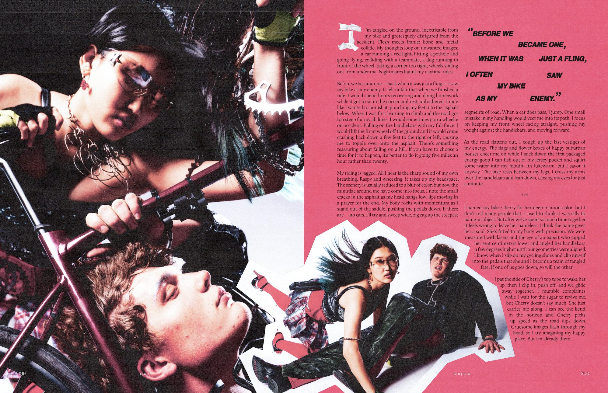 I named my bike Cherry, for her deep maroon color, but I don’t tell many people that. I used to think it was silly to name an object. But after we’ve spent so much time together it feels wrong to leave her nameless. I think the name gives her a soul. She’s fitted to my body with precision. We were measured with lasers and the eye of an expert who tapped her seat centimeters lower and angled her handlebars a few degrees higher until our geometries aligned. I know when I slip on my cycling shoes and clip myself into the pedals, she and I become a team of tangled fate. If one of us goes down, so does the other.