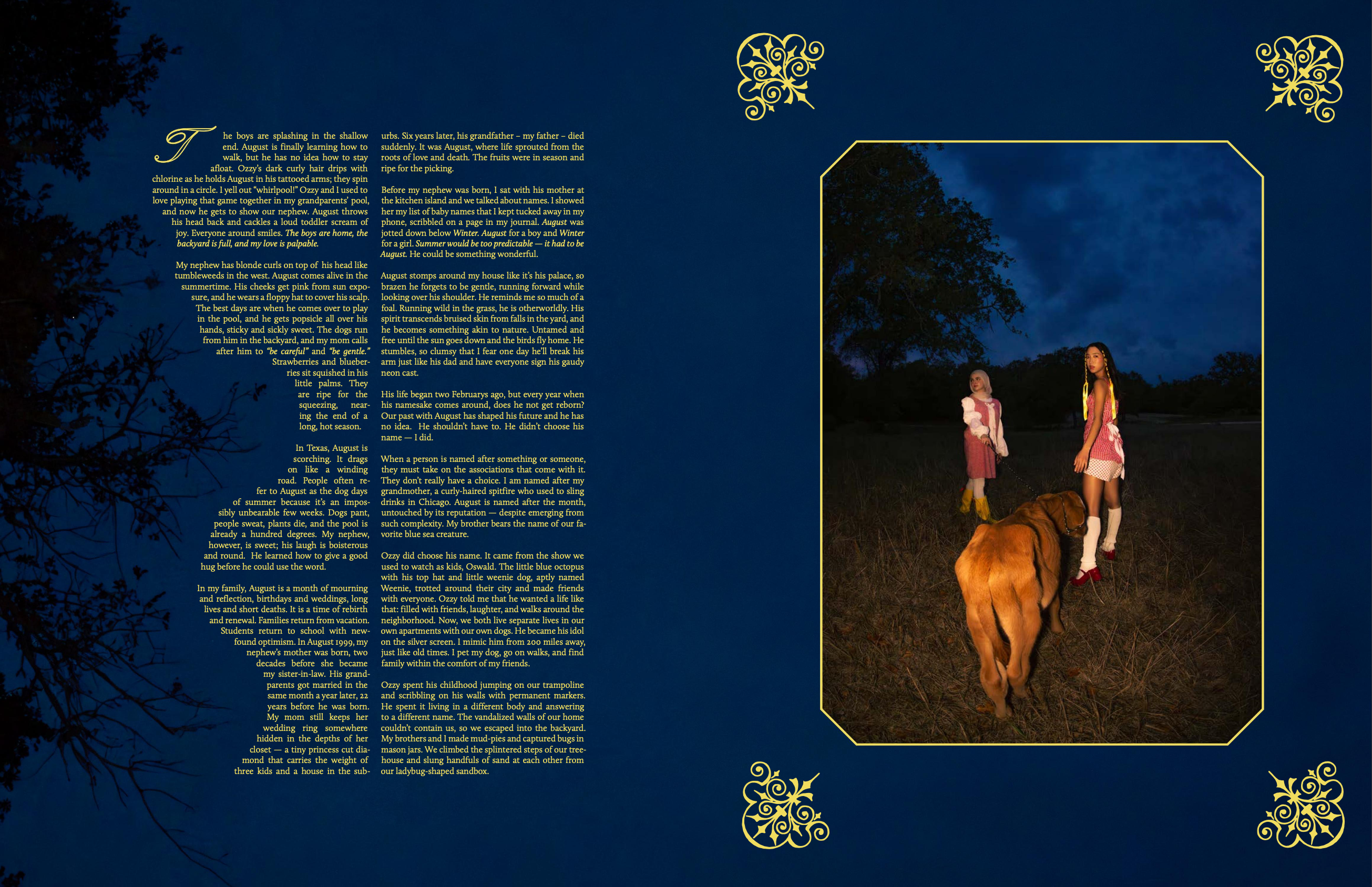 When a person is named after something or someone, they must take on the associations that come with it. They don't really have a choice. I am named after my grandmother, a curly-haired spitfire who used to sling drinks in Chicago. August is named after the month, untouched by its reputation — despite emerging from such complexity. My brother bears the name of our favorite blue sea creature.
